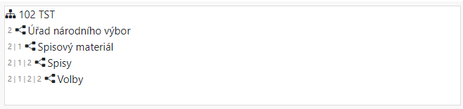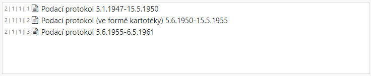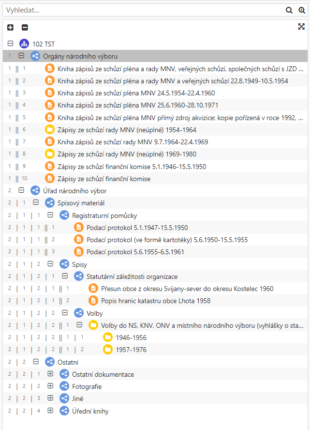 V levém panelu se nachází stromové znázornění hierarchie archivního souboru s možností vyhledávání. Po kliknutí na tlačítka + a - se zobrazí / skryjí potomci dané jednotky popisu.