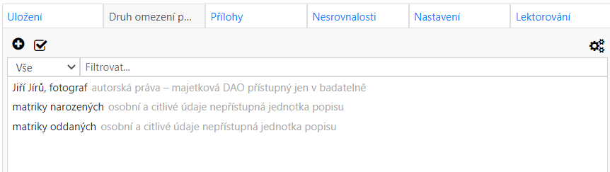 Přehled omezení k danému archivnímu souboru, které byly popsány pomocí prvku Druh omezení přístupnosti. V seznamu omezení je možné filtrovat a vyhledávat dle jejich stavů (Otevřený / Uzavřený) a hodnot.