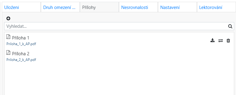 Umožňuje spravovat soubory přiložené k archivnímu souboru, které je možné připojit ke konkrétním jednotkám popisu pomocí prvku Příloha.