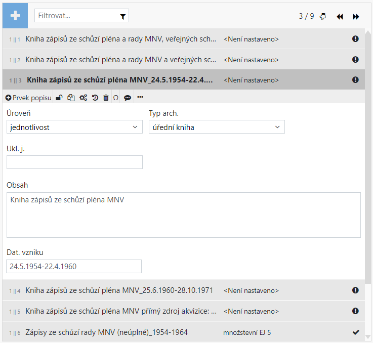 Upozornění, že jednotka popisu obsahuje nesrovnalosti. Při najetí na tuto ikonu se zobrazí jejich popis a přehled chybějících prvků.