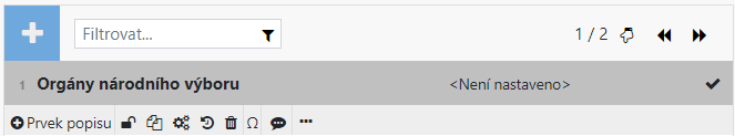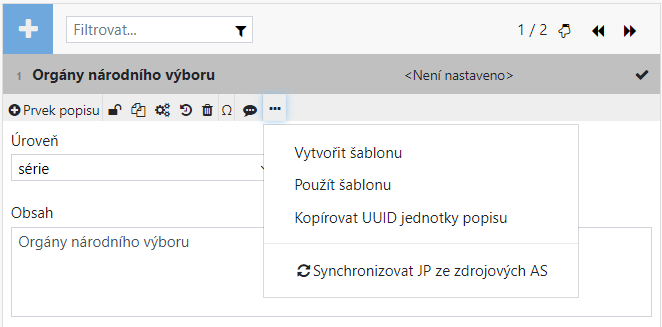 Možnosti filtrování a přechodu mezi stránkami seznamu jednotek popisu jsou k dispozici pouze při zapnutí zobrazení typu Akordeon v menu Nastavení zobrazení.