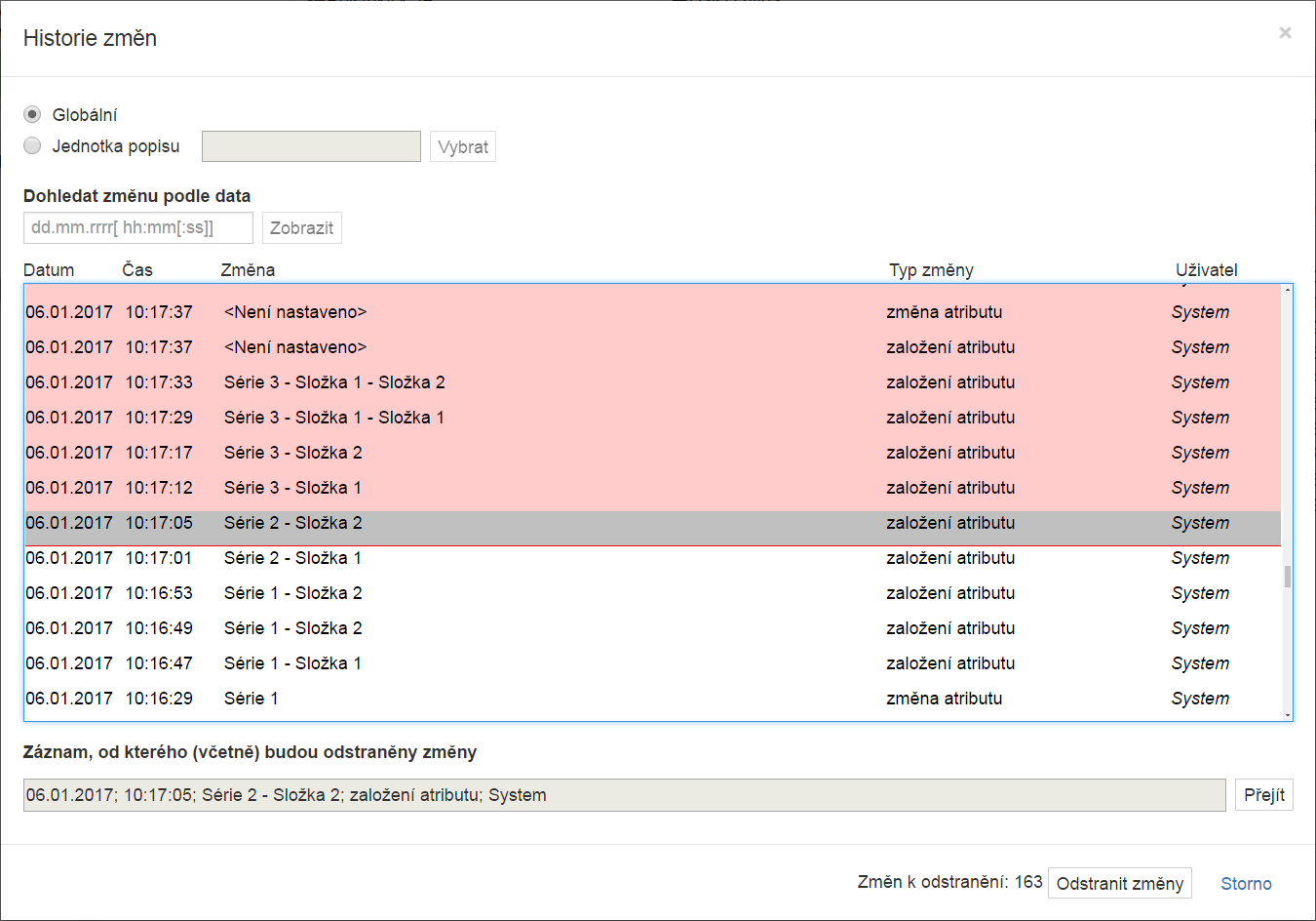 Otevře dialog pro správu historie změn, kde lze vrátit jak změny provedené nad celým archivním souborem tak i nad libovolnými jednotkami popisu. Po potvrzení se smaže vybraná změna a všechny změny s novějším datem, které po ní následovaly.