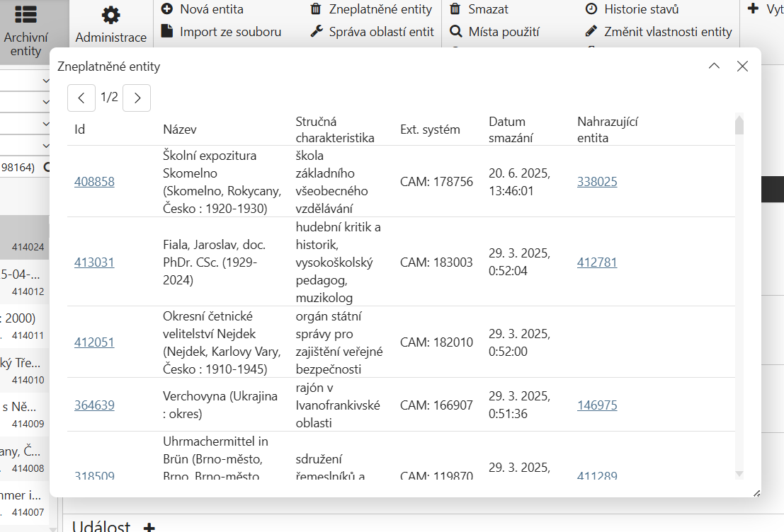 Ovládací prvek nabízí přehled všech archivních entit, které byly smazány nebo deduplikovány, a aktuálně se nacházejí ve stavech Zneplatněná, respektive Nahrazená.